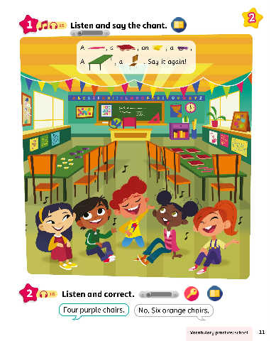 2 Anis Listen and say the chant. A , an , a Say it again! ABCDEFGHISKLMN OP• R S UV W X Y Z 12 B qu ele * V C (Э 48878 C. 2 n16 Listen and correct. (Four purple chairs. (No. Six orange chairs. Vocabulary practice: school 11