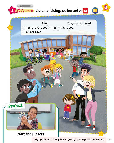 2 1 301.2 » Listen and sing. Do karaoke. Star, Star, how are you? I'm fine, thank you. I'm fine, thank you. How are you? Project Make the puppets. Language presentation and practice 2: greetings How are you? I'm fine, thank you. 13