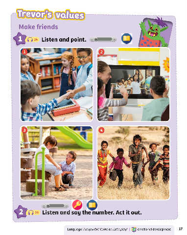 'Trevor's values Make friends 16 a Listen and point. 2 025 Listen and say the number. Act it out. Language: Are you OK? Come on! Let's play! | emotional development 17