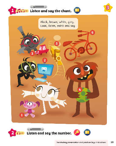3 Ana Listen and say the chant. Black, brown, white, grey. Look, listen, point and say. 2 IT 2 62 Listen and say the number. Vocabulary presentation and practice: toys and colours 19