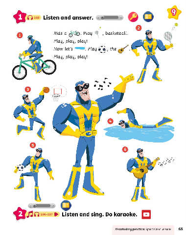 9 6 105 Listen and answer. Ride a 6TO. Play , basketball. Play, play, play! Now let's Play , the Play, play, play! 2 806 106-107 D Listen and sing. Do karaoke. Vocabulary practice: sports and leisure 65