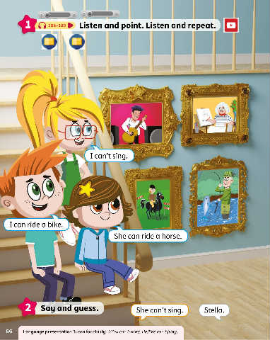 1 4 108-109 Listen and point. Listen and repeat. I can't sing. I can ride a bike. She can ride a horse. 2 Say and guess. She can't sing. Stella. 66 Language presentation 1: can for ability I/You can (swim). He/She can't (sing).