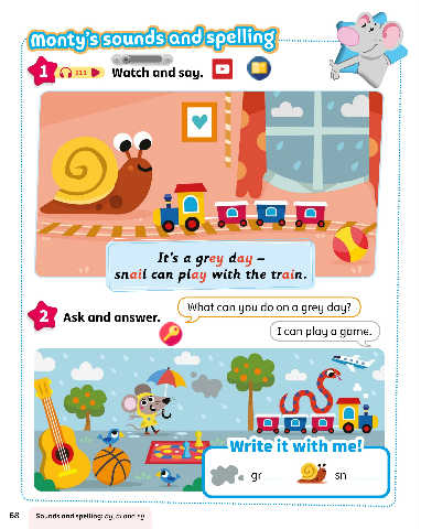 Monty's sounds and spelling 1 011 • Watch and say. It's a grey day - snail can play with the train. What can you do on a grey day? 2 Ask and answer. I can play a game. Write it with me! gr SN 68 Sounds and spelling: ay, ai and ey