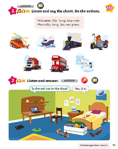 10 ].Anus Listen and say the chant. Do the actions. Helicopter, ship. Long, blue train. Motorbike, lorry. Bus and plane. 2 Gu6 Listen and answer. Is the red car in the shoe? Yes, it is. §D Vocabulary practice: transport 71