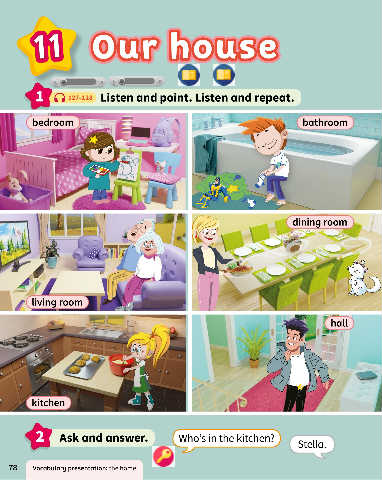 11 Our house 1 6 127-128 Listen and point. Listen and repeat. bedroom bathroom dining room living room hall kitchen 2 Ask and answer. Who's in the kitchen? Stella. 78 Vocabulary presentation: the home