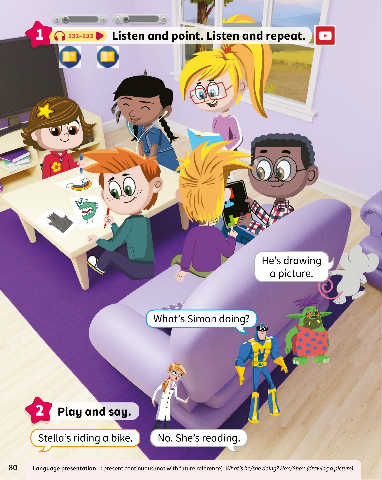 80 Language presentation 1: present continuous (not with future reference) What's he/she doing? He's/She's (drawing a picture).