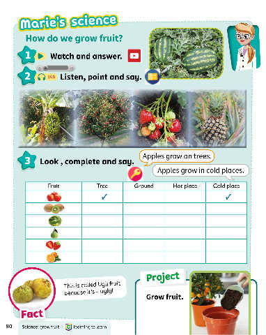 3 Look, complete and say. Apples grow on trees.