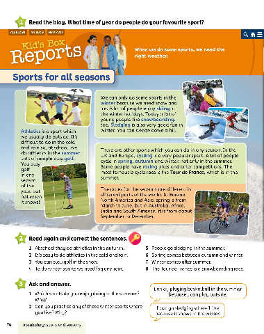 1 At school they do athletics in the autumn. 5 People go sledging in the summer.