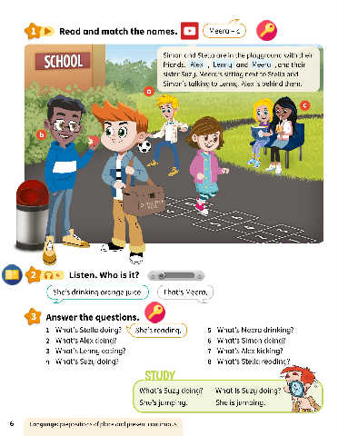 1 What's Stella doing? She's reading. 5 What's Meera drinking?