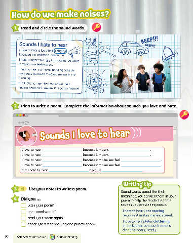 Plan to write a poem. Complete the information about sounds you love and hate.