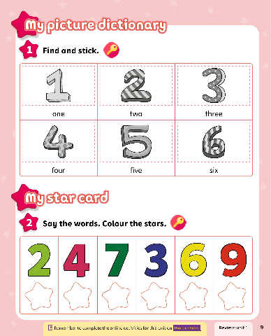 my picture dictionary Find and stick. 3 5 one two three four five six My star cord 2 say the words. Colour the stars. 247369 Review: unit 1 9 Remember to complete the online activities for this unit on Practice Extra