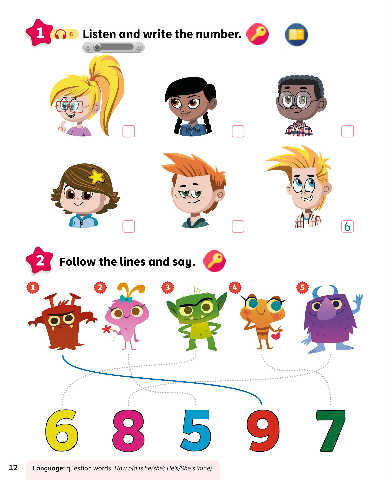 no Listen and write the number. kbng 16 Follow the lines and say. 6 8 5 9 7 12 Language: question words How old is he/she? He's/She's (nine).