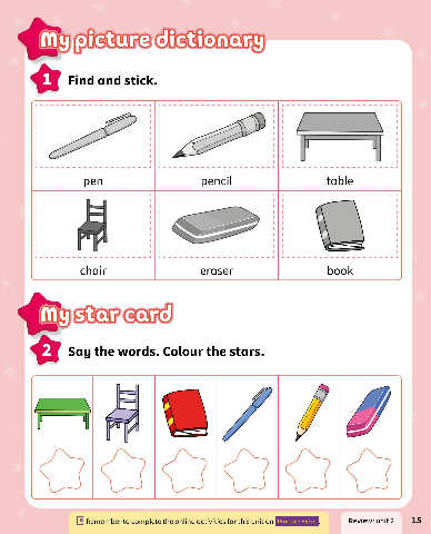 my picture dictionary Find and stick. pen pencil table chair eraser book mystar card Say the words. Colour the stars. Review: unit 2 15 Remember to complete the online activities for this unit on Practice Extra