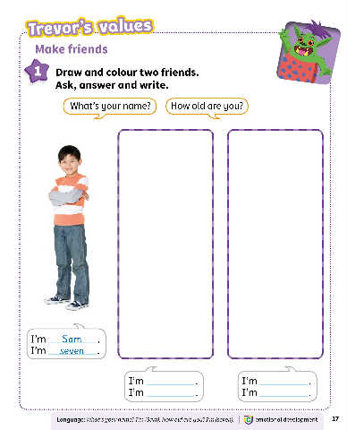 •Trevoris values Make friends Draw and colour two friends. Ask, answer and write. What's your name? How old are you? I'm Sam I'm seven I'm I'm I'm I'm 17 Language: What's your name? I'm (Sam). How old are you? I'm (seven). | T emotional development