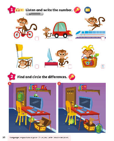 ho Listen and write the number. 2 Find and circle the differences. 2 ses 5 K* 20 Language: prepositions of place It's in / on / under / next to the (train).