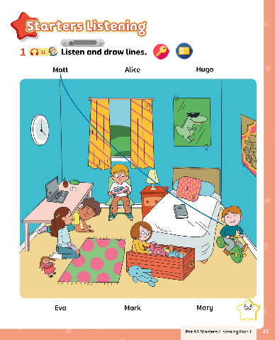 Starters Listening 1 01S Listen and draw lines. Matt Alice Hugo Eva Mark Mary Pre Al Starters: Listening Part 1 21