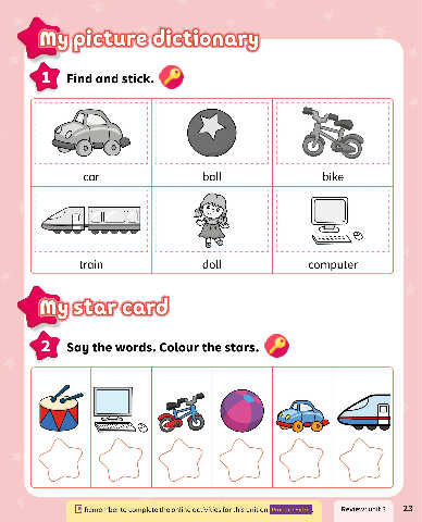 my picture dictionary Find and stick. car ball bike train doll computer My star cord 2 Say the words. Colour the stars. Review: unit 3 23 Remember to complete the online activities for this unit on Practice Extra
