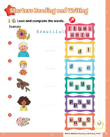 Starters Readiag and Writing 1 Look and complete the words. Example ftbai beautiful u elu di d Is a U y g h_y p p a U y g n Pre Al Starters: Reading and Writing Part 3 27