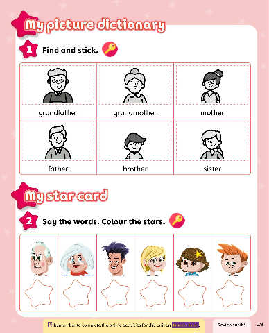 my picture dictionary Find and stick. grandfather grandmother mother father brother sister My star cord 2 Say the words. Colour the stars. Review: unit 4 29 Remember to complete the online activities for this unit on Practice Extra
