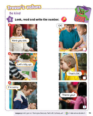 Trevor's values Be kind 1 Look, read and write the number. OK! Here you are. Let's tidy up! That's OK. I'm sorry. Thank you! Language: Here you are. Thank you. I'm sorry. That's OK. Let's tidy up! ] emotional development 31