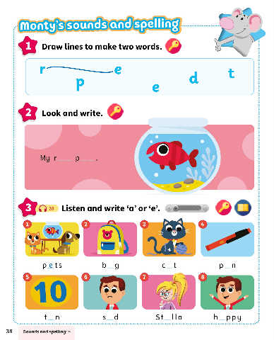 Monty's sounds and spelling Draw lines to make two words. • e d t P e • Look and write. My r. p 3 n wo Listen and write 'd' or 'e pets b _g c t p n 6 10 † n Sd St la h_ppy 38 Sounds and spelling: e