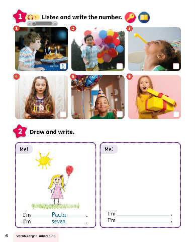1 03 Listen and write the number. 6 2 Draw and write. Me! Me! I'm Paula I'm I'm seven I'm 6 Vocabulary: numbers 1-10
