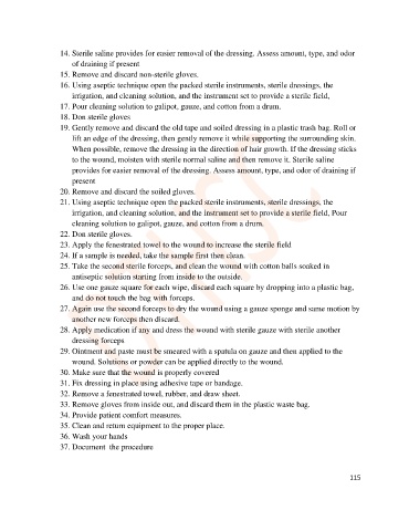 14. Sterile saline provides for easier removal of the dressing. Assess amount, type, and odor
