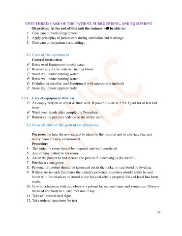 UNIT-THREE: CARE OF THE PATIENT, SURROUNDING, AND EQUIPMENT