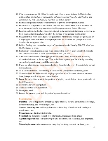 10. If the residual is over 50-100 ml in adults and 10 ml or more infants, hold the feeding