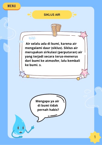 SIKLUS AIR Air selalu ada di bumi, karena air mengalami daur (siklus). Siklus air merupakan sirkulasi (perputaran) air yang terjadi secara terus-menerus dari bumi ke atmosfer, lalu kembali ke bumi. s. Mengapa ya air di bumi tidak pernah habis? 1