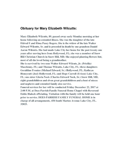 Obituary for Mary Elizabeth Wilcutts: