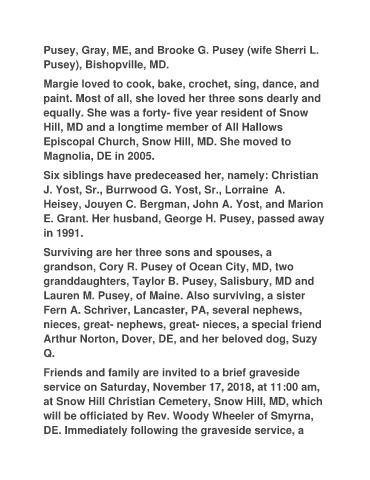 granddaughters, Taylor B. Pusey, Salisbury, MD and
