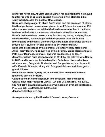 Norm was predeceased by his parents, Clarence Wesley Moran and