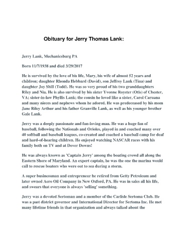 Jerry was a devoted Sertoman and a member of the Carlisle Sertoma Club. He