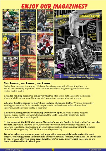 At the moment, the LHR Motorcycle Magazine's work is funded by just 2.4% of our regular