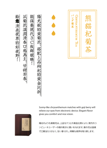 陽光般的黃菊花,搭配上品枸杞的黃金比例, 能保養現代3C族群眼睛! 以菊花溫潤清香口感為主,甘甜芳香, 給您清亮視界的好視野!