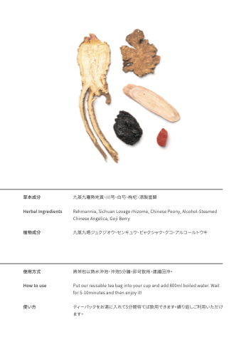 Rehmannia, Sichuan Lovage rhizome, Chinese Peony, Alcohol-Steamed Chinese Angelica, Goji Berry