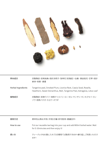 Tangerine peel, Smoked Plum, Licorice Root, Cassia Seed, Roselle, Hawthorn, Sweet Osmanthus, Malt, Tangerine Peel, Astragalus, Lotus Leaf