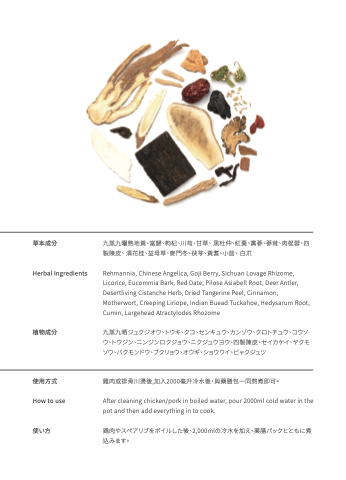 九蒸九晒ジュクジオウ、トウキ、クコ、センキュウ、カンゾウ、クロトチュウ、コウソ ウ、トウジン、ニンジンロクジョウ、ニクジュウヨウ、四製陳皮、セイカケイ、ヤクモ ソウ、バクモンドウ、ブクリョウ、オウギ、ショウウイ、ビャクジュツ