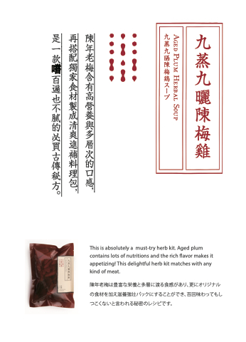 陳年老梅含有高營養與多層次的口感, 再搭配獨家食材製成清爽進補料理包, 是 一款嚐百遍也不膩的必買古傳秘方。