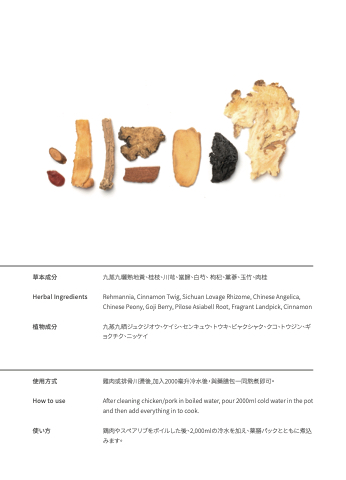 九蒸九晒ジュクジオウ、ケイシ、センキュウ、トウキ、ビャクシャク、クコ、トウジン、ギ ョクチク、ニッケイ