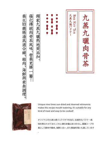 オリジナルの九蒸九晒ジュクジオウを加え、伝統的なバクテー風 味を際立たせており、これに勝る栄養はありません。薬膳スープの 素として豚肉や鶏肉、海鮮に合い、また精進料理にも適しています 。