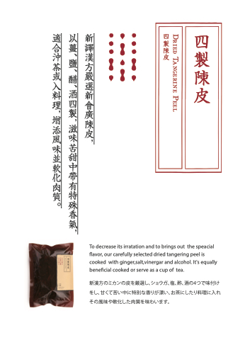 To decrease its irratation and to brings out the speacial flavor, our carefully selected dried tangering peel is cooked with ginger,salt,vinergar and alcohol. It's equally beneficial cooked or serve as a cup of tea.