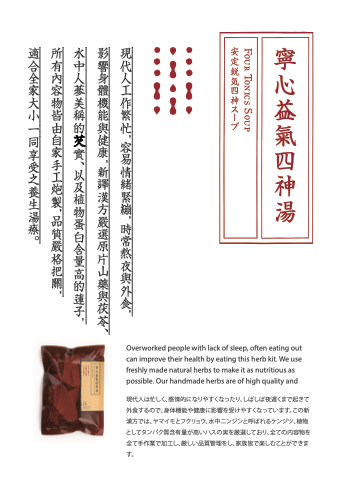現代人は忙しく、感情的になりやすくなったり、しばしば夜遅くまで起きて 外食するので、身体機能や健康に影響を受けやすくなっています。この新 漢方では、ヤマイモとフクリョウ、水中ニンジンと呼ばれるケンジツ、植物 としてタンパク質含有量が高いハスの実を厳選しており、全ての内容物を 全て手作業で加工し、厳しい品質管理をし、家族皆で楽しむことができま す。
