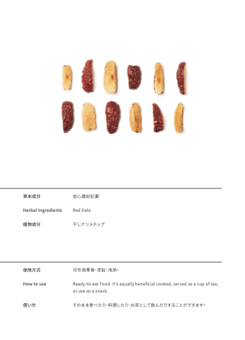草本成分 Herbal Ingredients 植物成分 使用方式 How to use 使い方 安心貴妃紅棗 Red Date 干しナツメチップ 可作為零食、烹飪、泡茶。 Ready-to-eat Food. It's equally beneficial cooked, served as a cup of tea, or use as a snack. そのまま食べたり、料理したり、お茶として飲んだりすることができます。