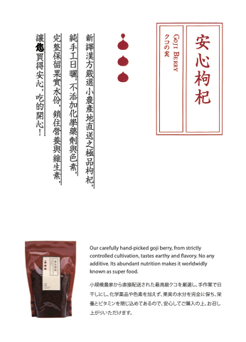 小規模農家から直接配送された最高級クコを厳選し、手作業で日 干しにし、化学薬品や色素を加えず、果実の水分を完全に保ち、栄 養とビタミンを閉じ込めてあるので、安心してご購入の上、お召し 上がりいただけます。
