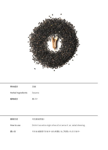 草本成分 Herbal Ingredients 植物成分 使用方式 How to use 使い方 芝麻 Sesame 黒ゴマ 可生飲或烹飪。 Drink it as extra virgin olive oil or serve it as salad dressing. そのまま飲用できます。また料理にもご利用いただけます。