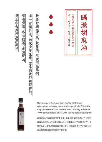 毒性のない台湾の黒ゴマを使用、農薬や除草剤を使わず、従来と は異なる手作りの少量生産により、当季採れたての黒ゴマだけを 使用しています。栄養豊富で香り高く、他の油を混ぜていない、正 真正銘の台湾西港の黒ゴマ油です。
