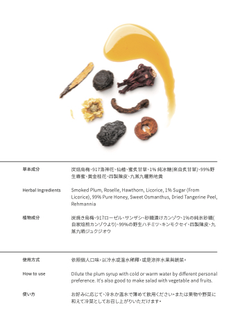 炭焙烏梅、917洛神花、仙楂、蜜炙甘草、1% 純冰糖(來自炙甘草)、99%野 生蜂蜜、黃金桂花、四製陳皮、九蒸九曬熟地黃