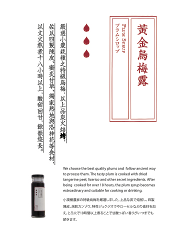 We choose the best quality plums and follow ancient way to process them. The tasty plum is cooked with dried tangerine peel, licerico and other secret ingredients. After being cooked for over 18 hours, the plum syrup becomes extroadinary and suitable for cooking or drinking.